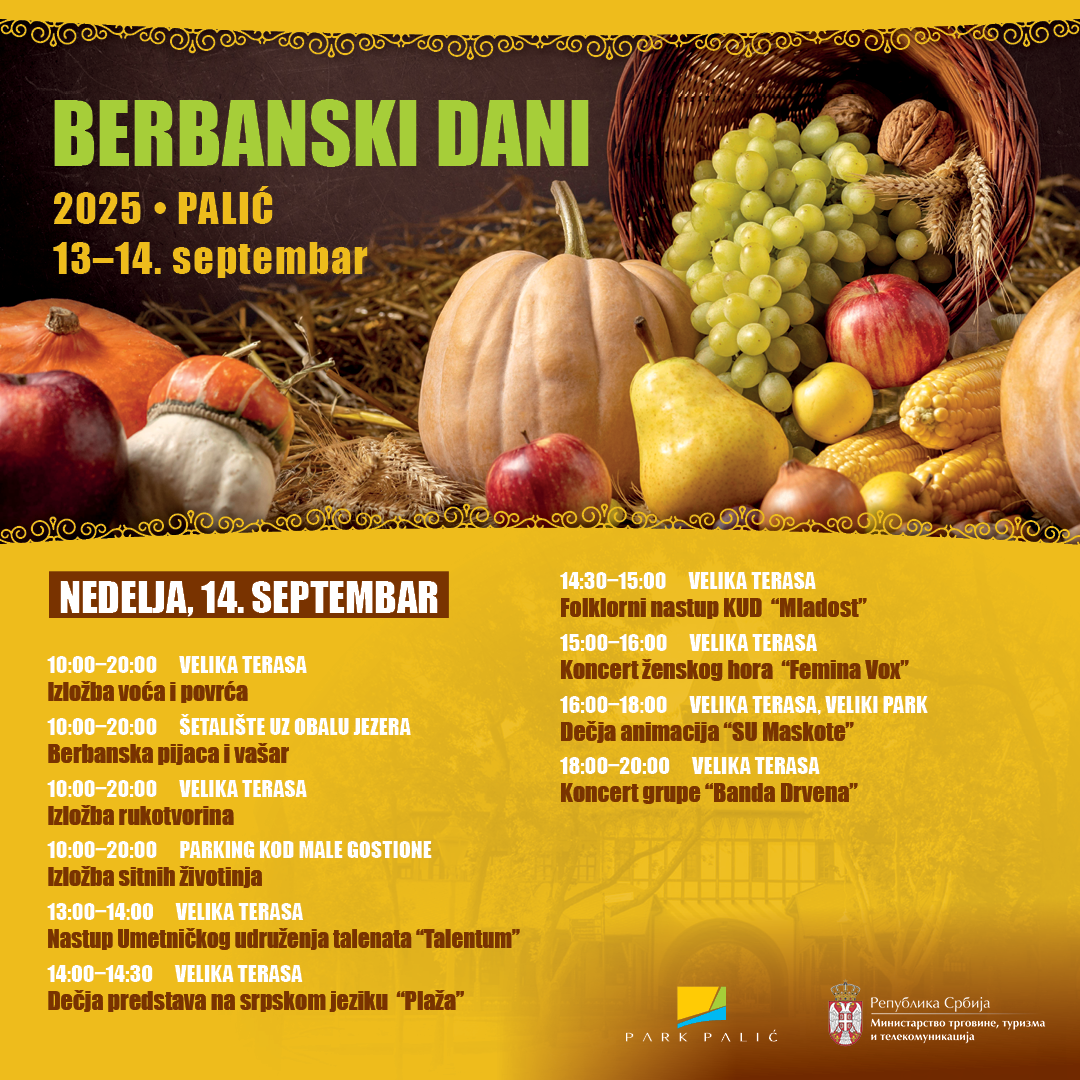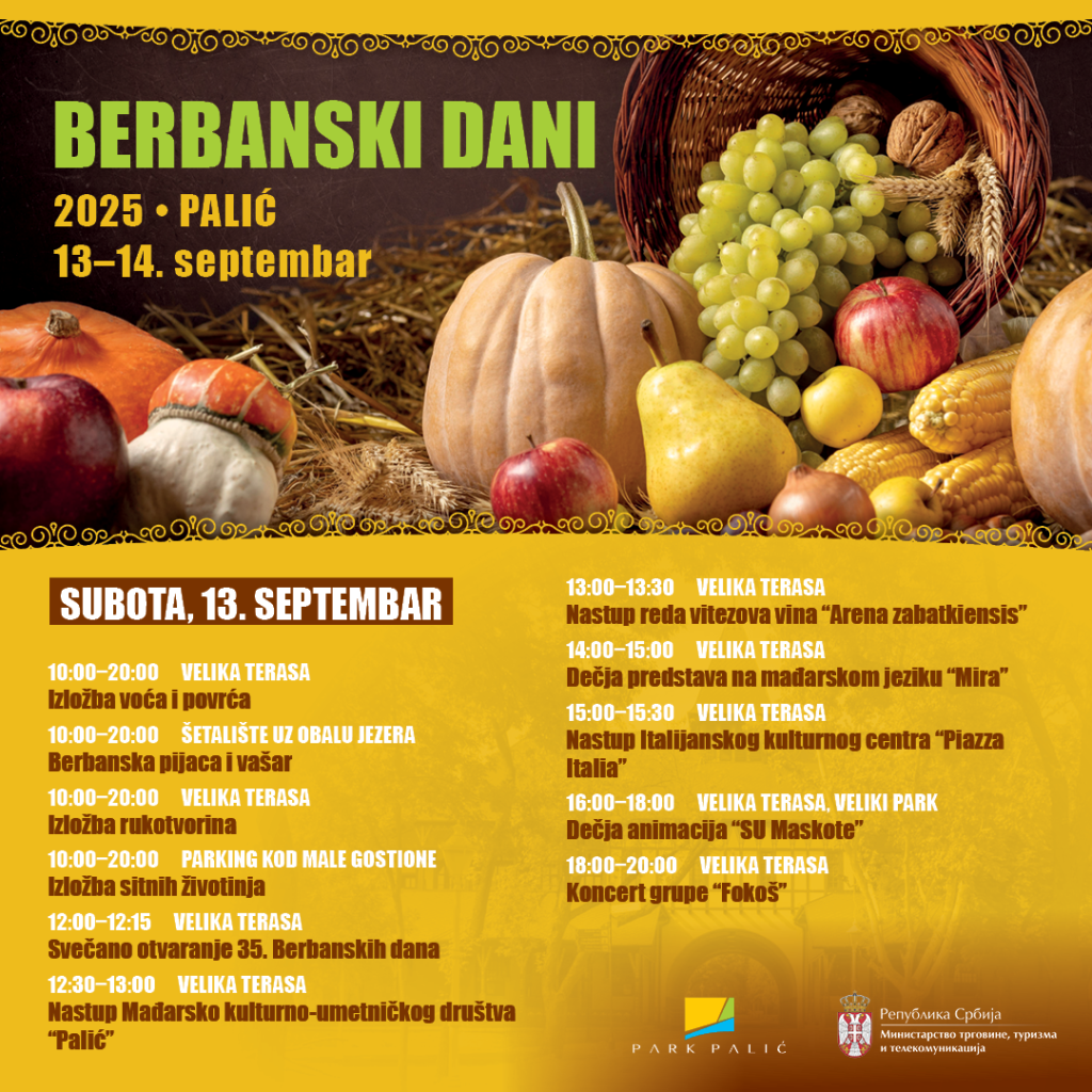 Ove godine 13. i 14. septembra održava se tradicionalna manifestacija Berbanski dani 2025 na Paliću. Manifestaciju ove godine obeležavamo po 35. put, u čast berbe plodova iz naših krajeva.